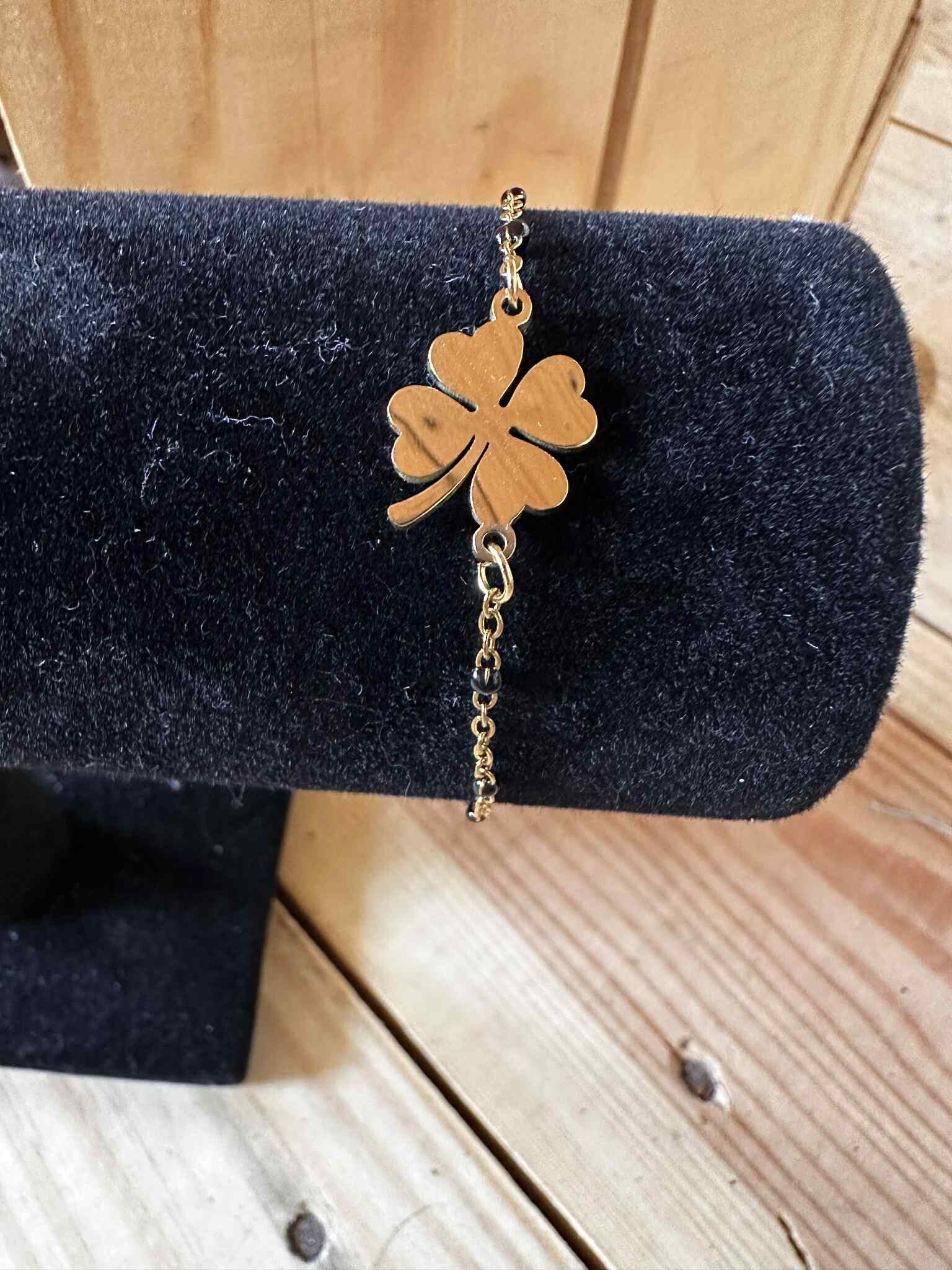 Pendentif central : Un trèfle à quatre feuilles doré est placé au centre, évoquant chance et protection.