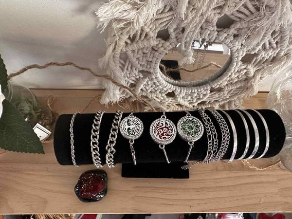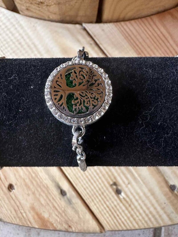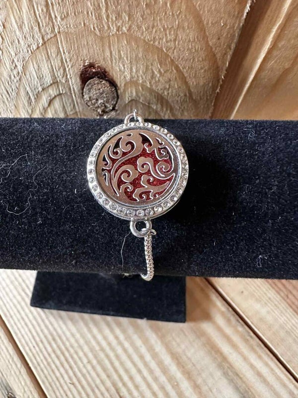 Bracelet “A parfumé” Sublimez vos journées avec ce bracelet unique, qui allie esthétique, bien-être et personnalisation. Son pendentif rond argenté gravé d’un motif s’ouvre pour accueillir des pads parfumés, disponibles en plusieurs couleurs. Il suffit d’ajouter une goutte de votre huile essentielle ou de votre parfums préférée pour transformer ce bijou en véritable diffuseur de parfum personnel.